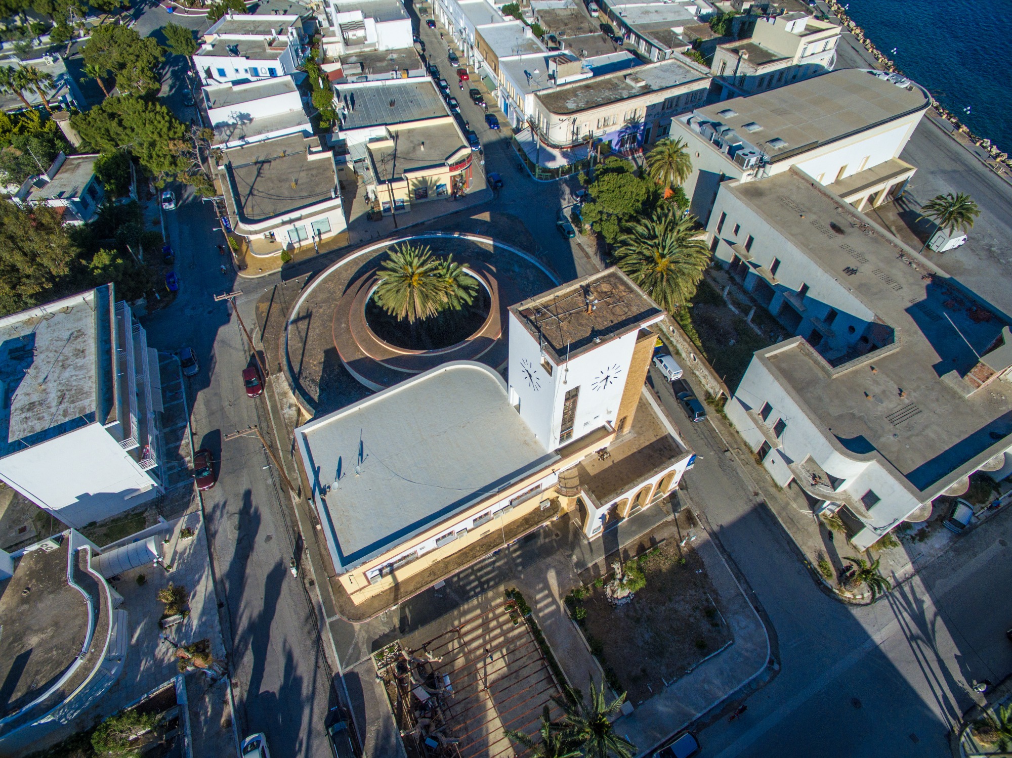 Οι μεγάλοι δρόμοι και οι επιβλητικές πλατείες, περιβάλλονται από μεγάλα δημόσια κτίρια, όπως το συγκρότημα της υπαίθριας αγοράς με το κυκλικό αίθριο και τον πύργο του ρολογιού, η εκκλησία, το σχολείο, το θέατρο, το νοσοκομείο, οι στρατώνες, αλλά και τα «παλατσίνα», οι κατοικίες που στέγαζαν Ιταλούς αξιωματικούς. Όλα τους, μ’ απλές αλλά εντυπωσιακές προσόψεις, λευκούς τοίχους, καμπύλες και χτιστά παραθυράκια. Ενα μίγμα art deco και Bauhaus που καλείται στην αρχιτεκτονική ρασιοναλισμός, διεθνισμός ή ορθολογισμός.
