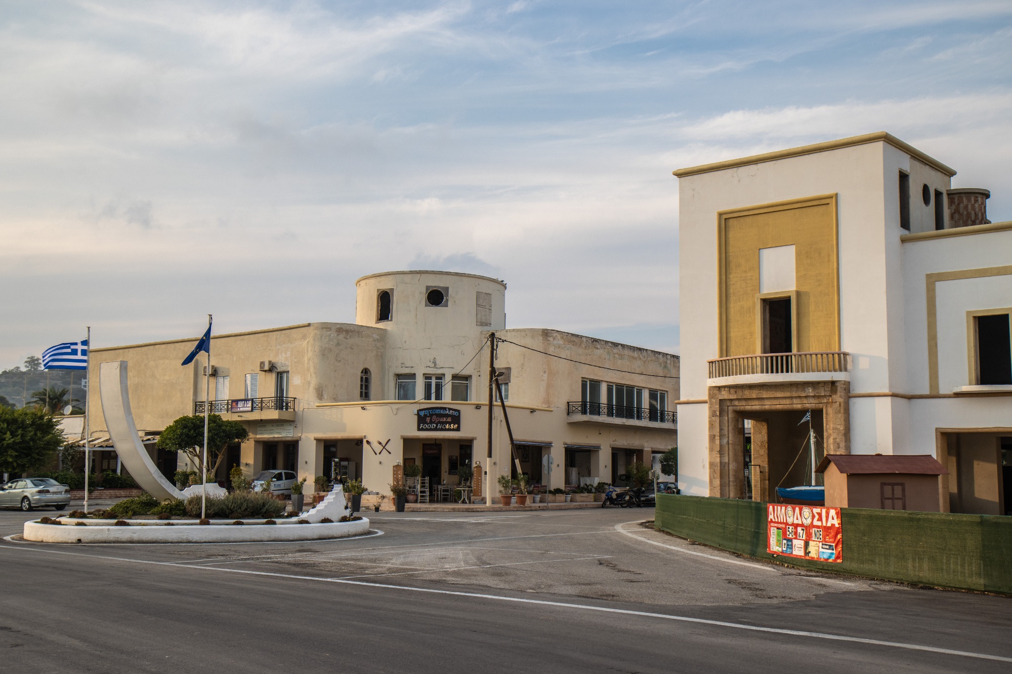 Το Κινηματοθέατρο που έχει ανακαινιστεί και σήμερα είναι λειτουργικό, δίπλα του το πρώην ξενοδοχείο «Albergo Roma» που άνοιξε τις πύλες του το 1938/Photo: Μάρκος Σπανός