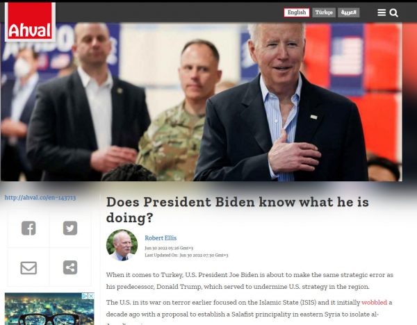 «Στην περίπτωση της Τουρκίας ο πρόεδρος των ΗΠΑ, Τζο Μπάιντεν ετοιμάζεται να κάνει το ίδιο στρατηγικό λάθος με τον προκάτοχο του, Ντόναλντ Τραμπ, που υπονόμευσε την στρατηγική των ΗΠΑ στην περιοχή». Αυτό επισημαίνει σε άρθρο του στην ιστοσελίδα Ahval ο Ρόμπερτ Έλλις, αναλυτής για θέματα Τουρκίας, σε διεθνή και δανέζικα ΜΜΕ, ενώ υπήρξε και σύμβουλος της Ομάδας Αξιολόγησης της Τουρκίας στο Ευρωπαϊκό Κοινοβούλιο.