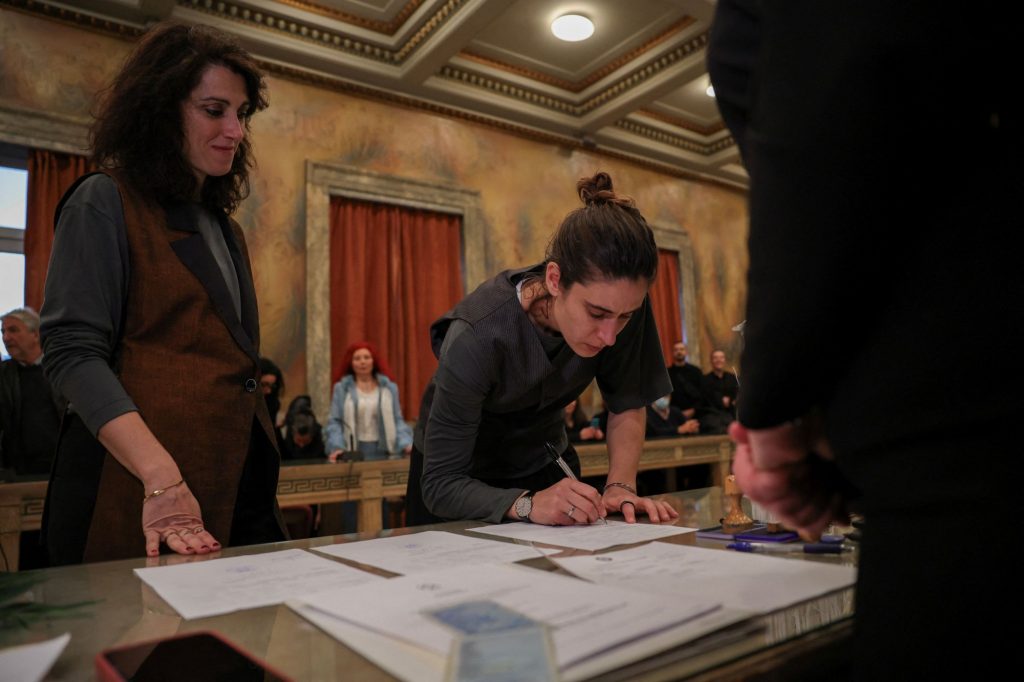 Ο γάμος της Αλεξίας Μπεζίκης και της Δανάης Δεληγεώργη τελέστηκε στο Δημαρχείο Αθηνών από τον Δήμαρχο, Χάρη Δούκα.