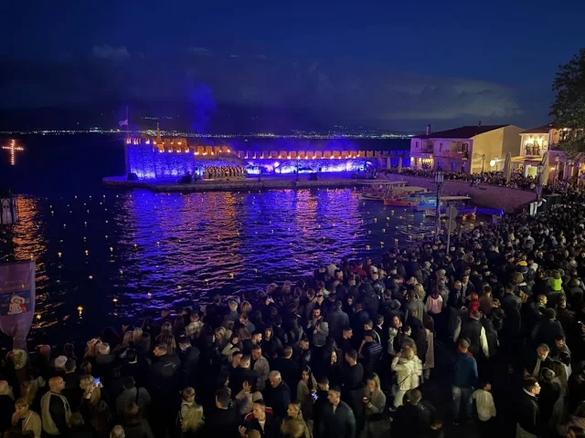 Το σκηνικό επιβλητικό, καθώς ο φλεγόμενος σταυρός έστεκε στην είσοδο του Λιμανιού και δεκάδες δάδες ήταν αναμμένες στις πολεμίστρες. Νωρίτερα, η διεθνούς φήμης σοπράνο Σόνια Θεοδωρίδου ερμήνευσε το αριστουργηματικό έργο του σπουδαίου συνθέτη Σταύρου Κουγιουμτζή «Ύμνοι Αγγέλων σε ρυθμούς ανθρώπων» με τη συμμετοχή της Μικτής Χορωδίας Ναυπάκτου υπό τη διεύθυνση της μαέστρου Ελένης Παπαδοπούλου-Αραβαντινού. Συνόδευσαν μουσικά οι Ηλίας Καλούδης, Γιώργος Κονής και απήγγειλε ο Ιεροκλής Μηχαηλίδης.